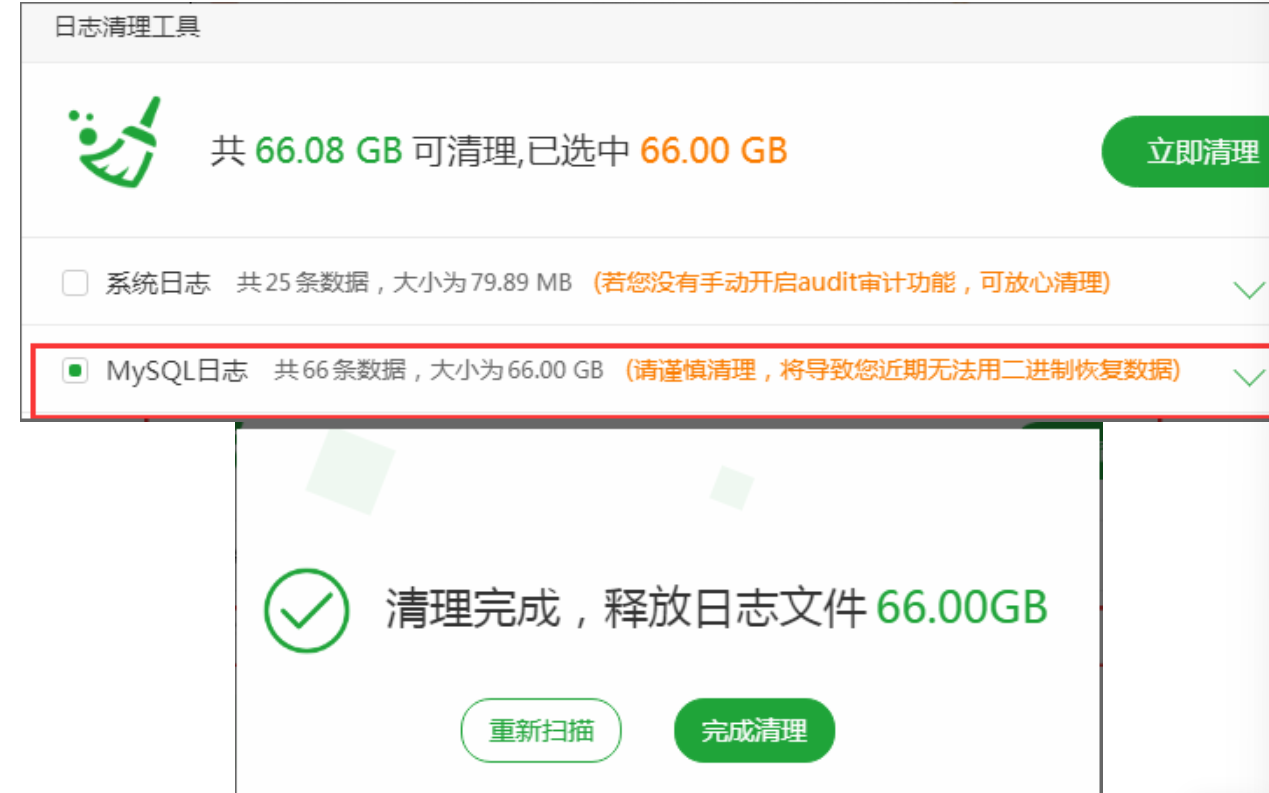 故障描述:客户Mysql数据库长时间未清理,导致日志增多占用了磁盘大部分空间。