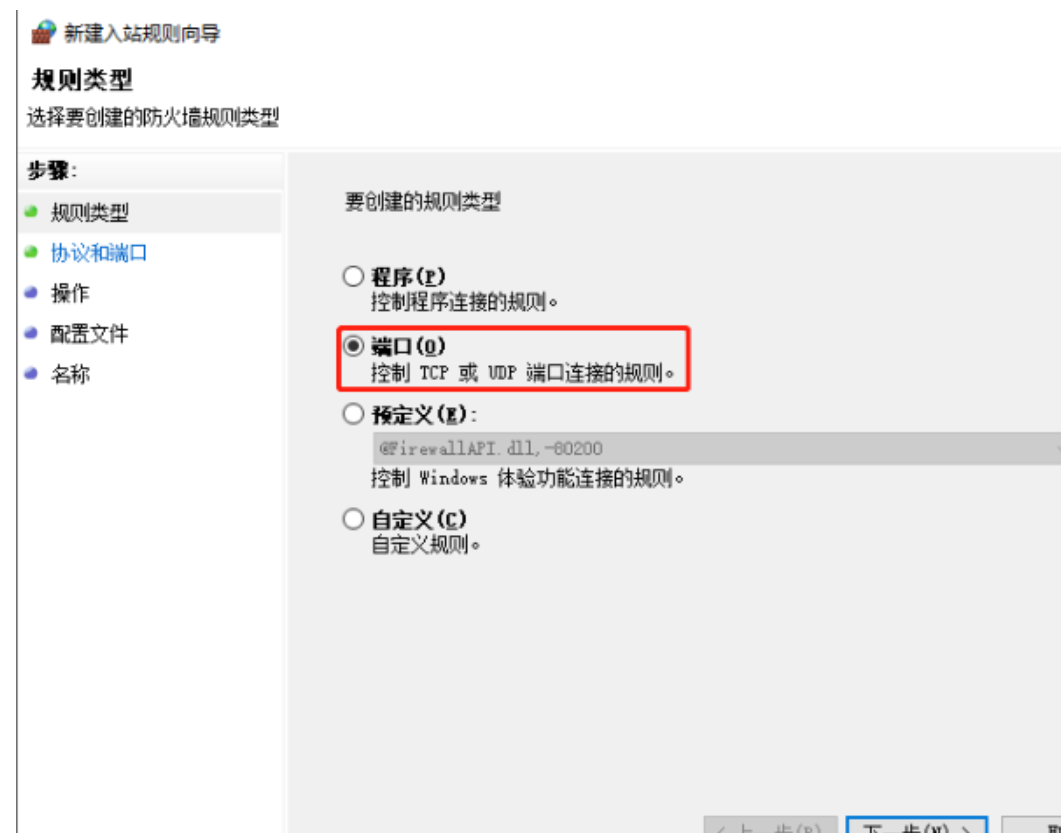 2、打开“入站规则”窗口,在右侧框中点击“新建规则”,出现如下界面,选择“端口”,点击下一步后,选择‘阻止连接’,继续下一步
