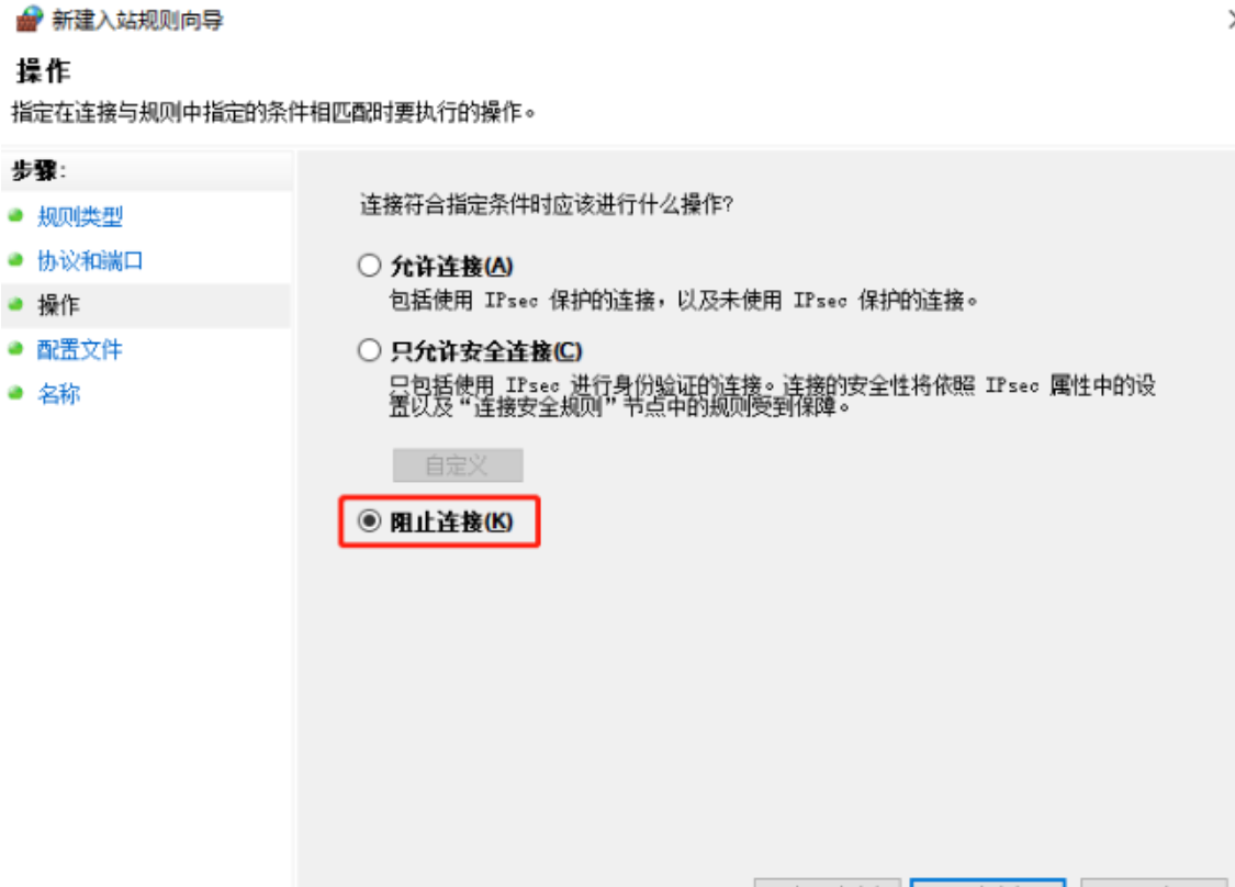 3、在‘特定本地端口’中输入需要禁用的端口,如445;点击‘下一步’后选择‘阻止连接’,继续‘下一步’。