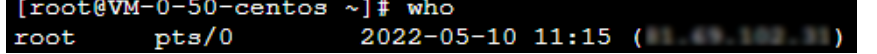 执行?who?命令,通过?/var/run/utmp?查看当前登录用户的信息。 返回结果如下图所示: