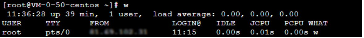 执行命令?w,通过?/var/run/utmp?查看当前登录的用户名并显示该用户当前执行的任务。 返回结果如下图所示:
