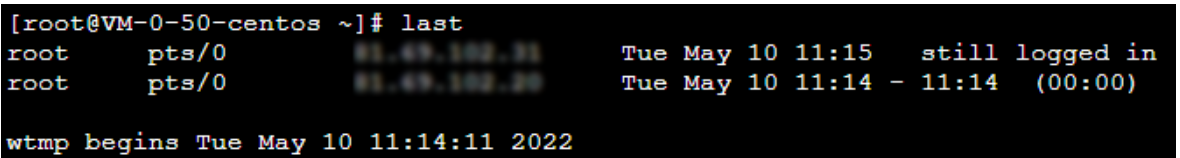 执行命令?last,通过?/var/log/wtmp?查看当前和曾经登录系统的用户信息。 返回结果如下图所示: