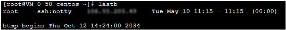 执行命令?lastb,通过 查看所有登录系统失败的用户的信息。 返回结果如下图所示:/var/log/btmp