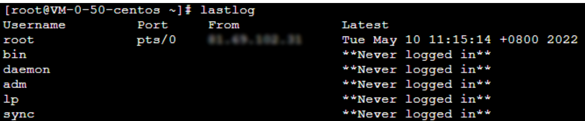 执行命令?lastlog,通过 查看用户最后一次登录的信息。 返回结果如下图所示:/var/log/lastlog
