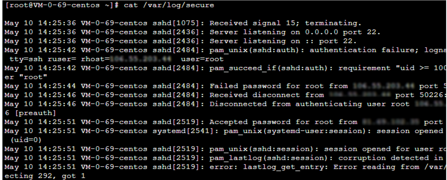 执行命令?cat /var/log/secure,查看登录信息。返回结果如下图所示: